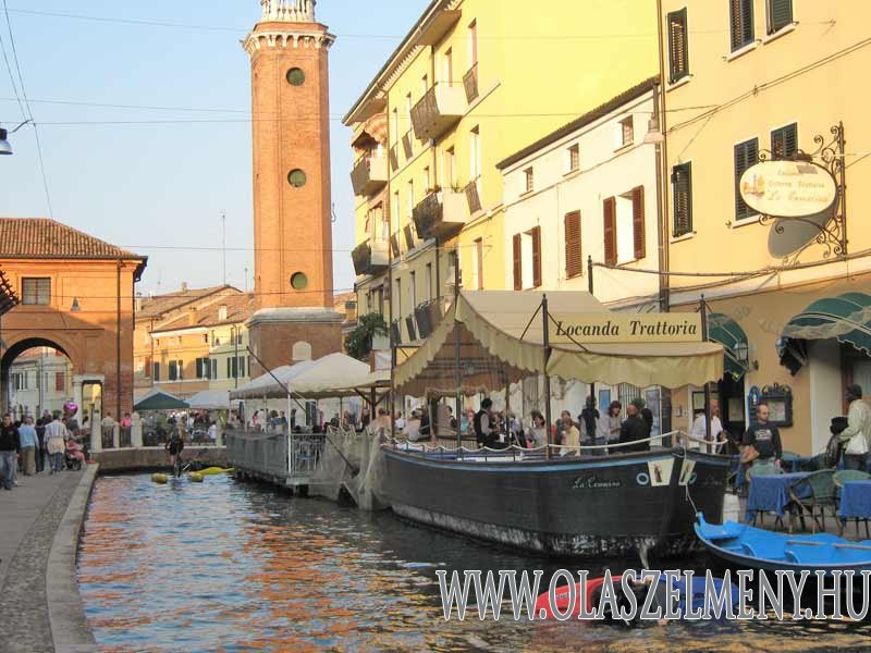 Comacchio csatorna5 km-re található Comacchiót is érdemes felkeresnünk nemcsak építményei miatt, hanem mivel nagyon hangulatos városka és kicsi hídjai és csatornái miatt „kis Velencének” is nevezik.Ez a halászváros 13 homokos kis szigeten épült, a lagúna északi része és a tenger köztött.Ez a lagúna a Valli di Comacchio természeti rezervátum részét képezi. A lagúnát a tengertől egy homokos sarló alakú földsáv választja el. Itt torkollik a tengerbe a Pád folyó egyik mellékága is, ami a víznek kissé édes ízt kölcsönöz.