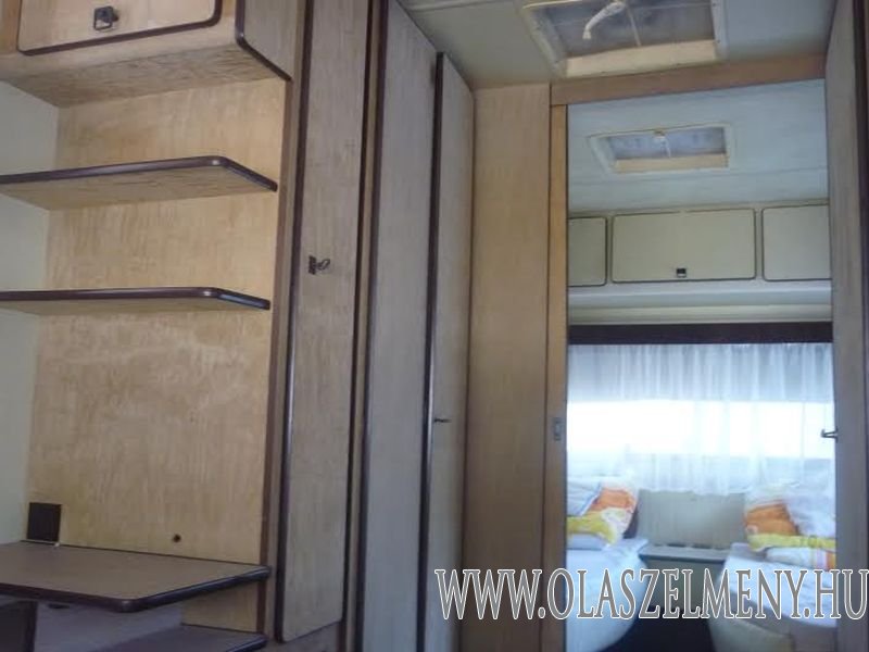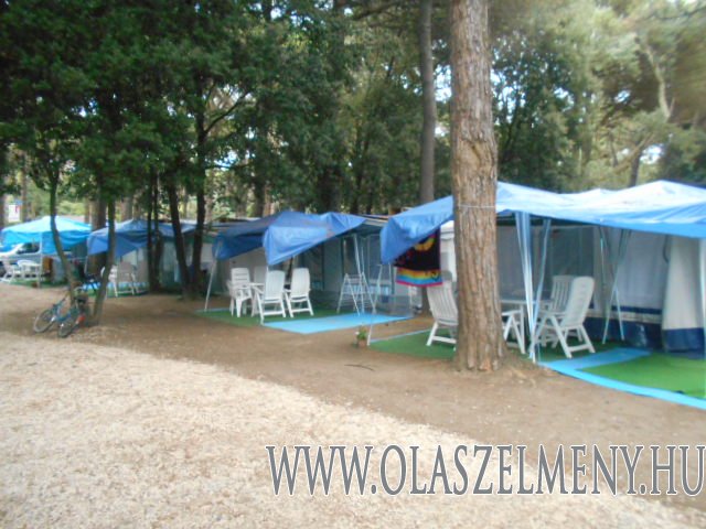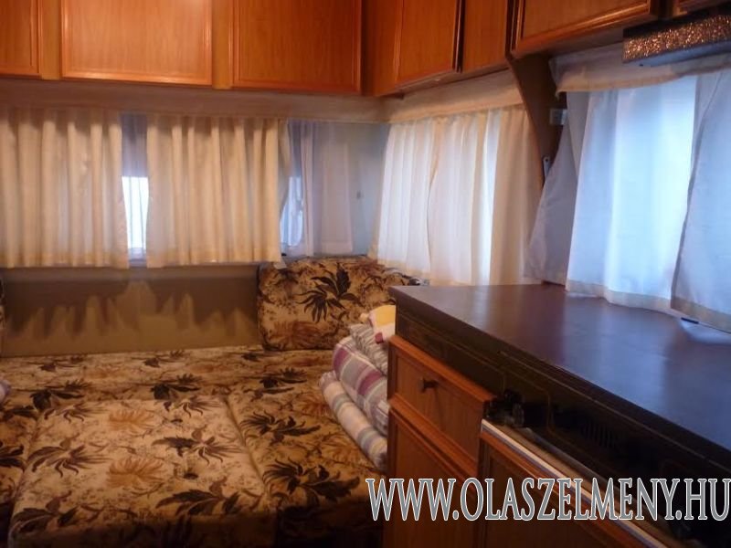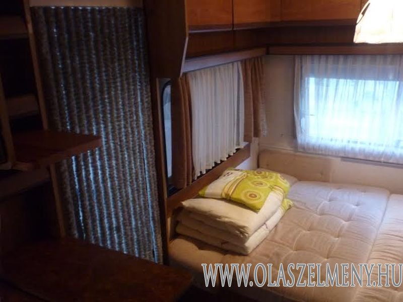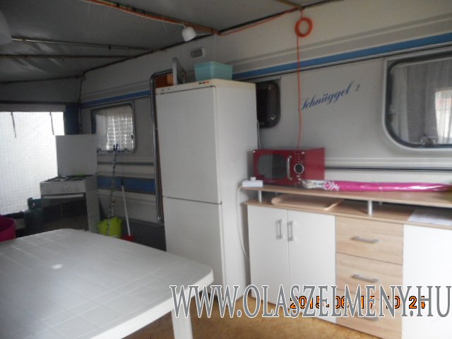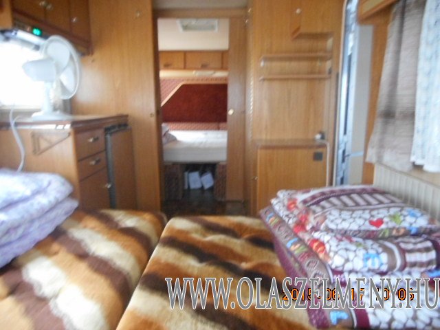 A lakókocsik a fák alatt vannak elhelyezve, az elő sátorral és a sörsátorral,mely együtt biztosít kellemes pihenést öt fő részére. A nagyméretű elő sátorban kapott helyet a konyhai blokk főzőhellyel, hűtőszekrénnyel és fagyasztóval. A lakókocsi hálószobaként működik, a két végében egy-egy kétszemélyes franciaágy található. A lakókocsiban lévő főző, mosogató és mosdó rendszer nincs beüzemelve. Víz a vizesblokkból vételezhető. Az étkezőasztal és a nyugágyak az árnyékot adó pavilon alatt vannak elhelyezve, , ami szintén a kényelmet szolgálja. A felszerelések között minden eszköz megtalálható, a főzéshez, tálaláshoz, étkezéshez és alváshoz, öt személy részére (az ágyneműhuzatról, lepedőről mindenki maga gondoskodik). Fontos,hogy a lakókocsit és tartozékait mindenki
